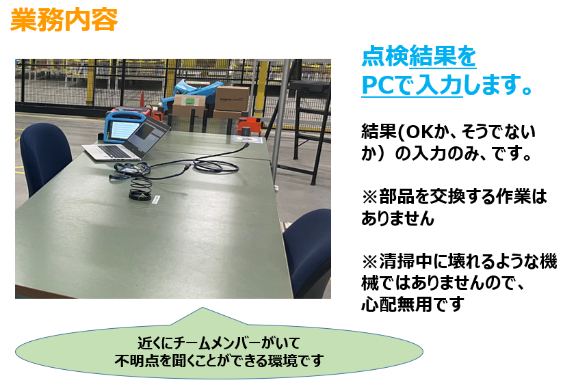 マシンキーパーの主な業務は、物流機器の清掃(掃除機でゴミを吸い取る、レンズを布で拭く等)点検のサポートです。機械設備の知識は不要です。詳細は画像をご参照ください。